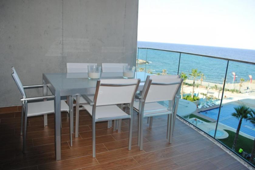 Apartamento en primera línea con vistas al mar inigualables, excelentes acabados y amplias áreas comunes equipadas con todos los lujos. Desde el balcón (17 m² en el 4º piso) también puedes disfrutar de hermosas vistas a las áreas comunes, las piscinas y el paseo marítimo, el parque natural de Cala Ferris e incluso al puerto y la ciudad de Torrevieja.