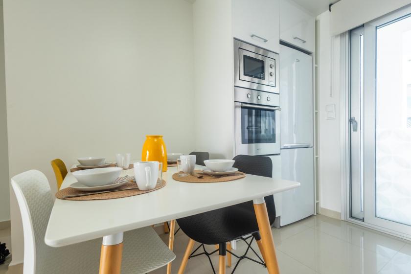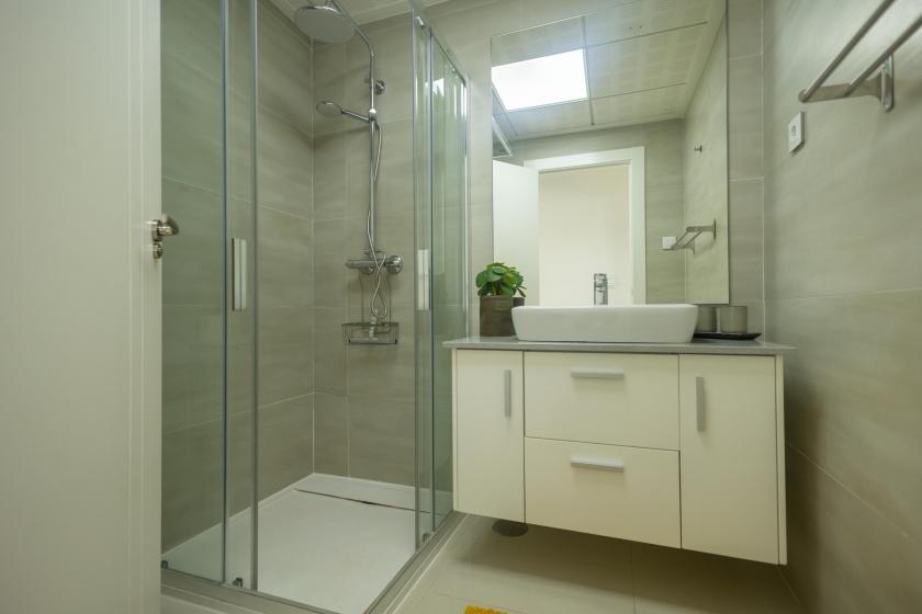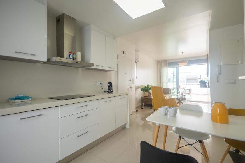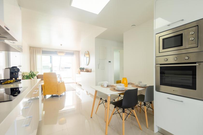 El apartamento es amplio y decorado con buen gusto, con una sala de estar que incluye un televisor inteligente, WiFi y una cocina abierta completamente equipada con todos los electrodomésticos necesarios, incluida un lavavajillas. Hay dos baños (uno de ellos en suite) con duchas a ras de suelo y dos dormitorios, uno con una cama doble y otro con dos camas individuales, todos con armarios empotrados. La calefacción y el aire acondicionado están disponibles para refrigeración y calefacción.