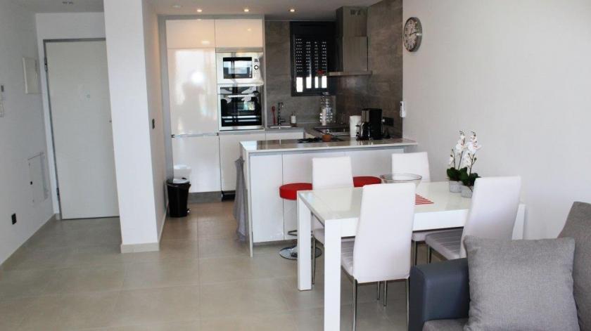 Además, hay un trastero donde se encuentra la lavadora. La cocina semiabierta, con barra, es moderna y está completamente equipada con todos los electrodomésticos, incluyendo un lavavajillas. El salón cuenta con aire acondicionado (frío y calor), televisión por satélite con canales internacionales y Wi-Fi. El apartamento está terminado con materiales de la mejor calidad de acuerdo con las nuevas normativas europeas. El complejo es seguro y cuenta con un garaje subterráneo.