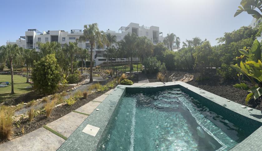 - Orientation: Orienté au sud, l'appartement est entièrement meublé et dispose de la climatisation intégrée et de volets motorisés. Profitez de la grande terrasse privée de 128 m² offrant une vue sur la piscine commune et le jardin.